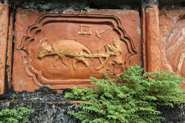 Khu di tích Quán giá hiện nay vẫn giữ nguyên được kết cấu trúc cảnh quan ban đầu: tam quan, sân và nhiều dãy nhà ngang dọc cấu thành. Nghi môn có cổng phụ hai bên và từ đây nối ra là bức tường bao, trên gắn 43 mảng chạm cổ bằng đất nung rất độc đáo, chạm nổi các đề tài dân gian, mỗi mảng có kích thước cao 25cm nếu là mảng chạm hoa có hình vuông, hoặc 28cm nếu là mảng chạm hình chữ nhật, có mảng hình rồng được chắp từ ba mảng nhỏ dài 106cm. Những mảng chạm này, ngoài các hình rồng, lân, voi, ngựa, hươu,... còn có một số hoạt cảnh như các cô gái tắm hồ sen, người đi săn, cày bừa, người cưỡi báo, đánh cờ,... Có một số người được ghi tên như Vương Sinh, Lão Tiên và một số câu chúc.