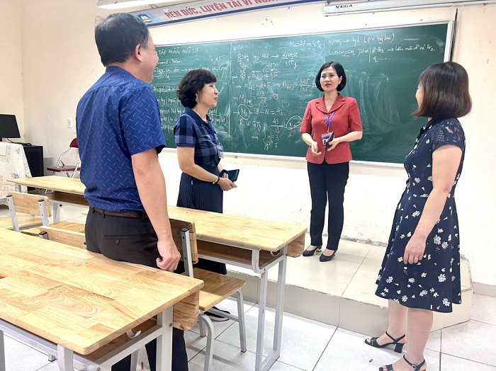 Phó Chủ tịch UBND quận Long Biên (đứng giữa) kiểm tra tại điểm thi Trường THPT Nguyễn Gia Thiều