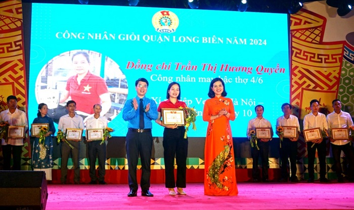 Phó Chủ tịch LĐLĐ Thành phố Nguyễn Thị Thu Thủy và Phó Bí thư Thường trực Quận ủy Long Biên Ngô Mạnh Điềm trao Chứng nhận cho Công nhân giỏi