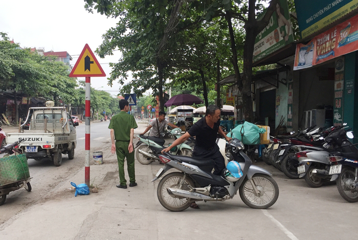 Lực lượng Công an huyện nhắc nhở người dân không để xe phương tiện giao thông lấn chiếm vỉa hè