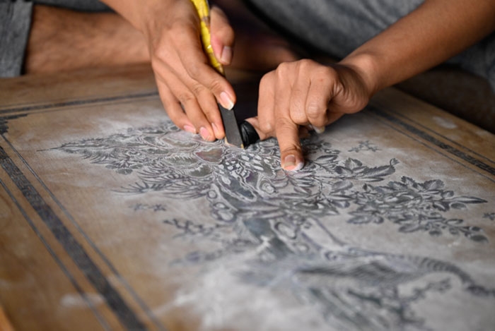 Để tạo ra một sản phẩm khảm trai, nghệ nhân phải trải qua nhiều công đoạn tỉ mỉ và tinh tế như vẽ hình, đục khuôn mẫu, phun sơn, ép vỏ trai...Trong ảnh nghệ nhân khảm trai l