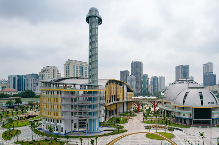 Ngay lối cổng vào mặt đường Phạm Hùng, nổi bật là tháp thiên văn cao 68m, bên trong lắp hai ống nhòm và kính thiên văn. Khi đưa vào hoạt động, các em nhỏ có thể ngắm toàn cảnh Thành phố cũng như tìm hiểu về thiên văn học. Buổi tối, tháp được thắp sáng, tạo hình ngọn đuốc lớn