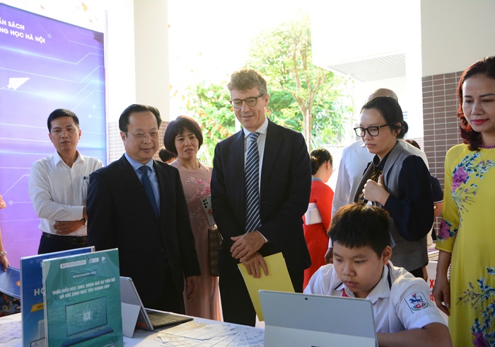 Giám đốc Sở Giáo dục và Đào tạo Hà Nội Trần Thế Cương cùng Trưởng Đại diện UNESCO tại Việt Nam tham quan khu trưng bày sách tại sự kiện