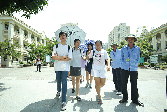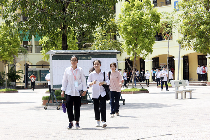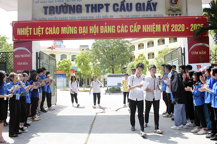 Những thí sinh đầu tiên hoàn thành bài thi môn Toán tại điểm thi Trường THPT Cầu Giấy