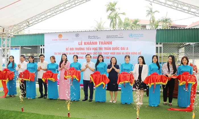 Nhân dịp này, các đại biểu đã dự lễ khánh thành bể bơi của Trường Tiểu học Thị trấn Quốc Oai A, được đầu tư theo Dự án “Hỗ trợ triểu khai các can thiệp hiệu quả và bền vững để phòng, chống đuối nước trẻ em tại Việt Nam”.
