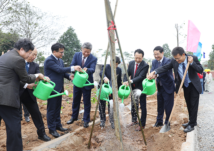 Phó Chủ tịch UBND Thành phố Nguyễn Mạnh Quyền cùng các đại biểu trồng cây tại Khu công nghiệp hỗ trợ Nam Hà Nội