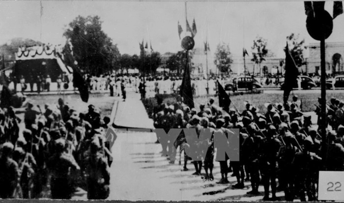Vườn hoa Ba Đình rực rỡ cờ hoa và biểu ngữ. Một lễ đài cao bằng gỗ căng vải đỏ vươn lên như một đài hoa chiến thắng. Hàng chục vạn nhân dân Hà Nội và các tỉnh đã nườm nượp về đây dự ngày hội lớn, cuồn cuộn như một đại dương dậy sóng, sóng người và sóng cờ. Bầu trời Ba Đình rung lên trong tiếng hô “Nước Việt Nam của người Việt Nam”, “Ủng hộ Chủ tịch Hồ Chí Minh” “Hồ Chí Minh muôn năm”.